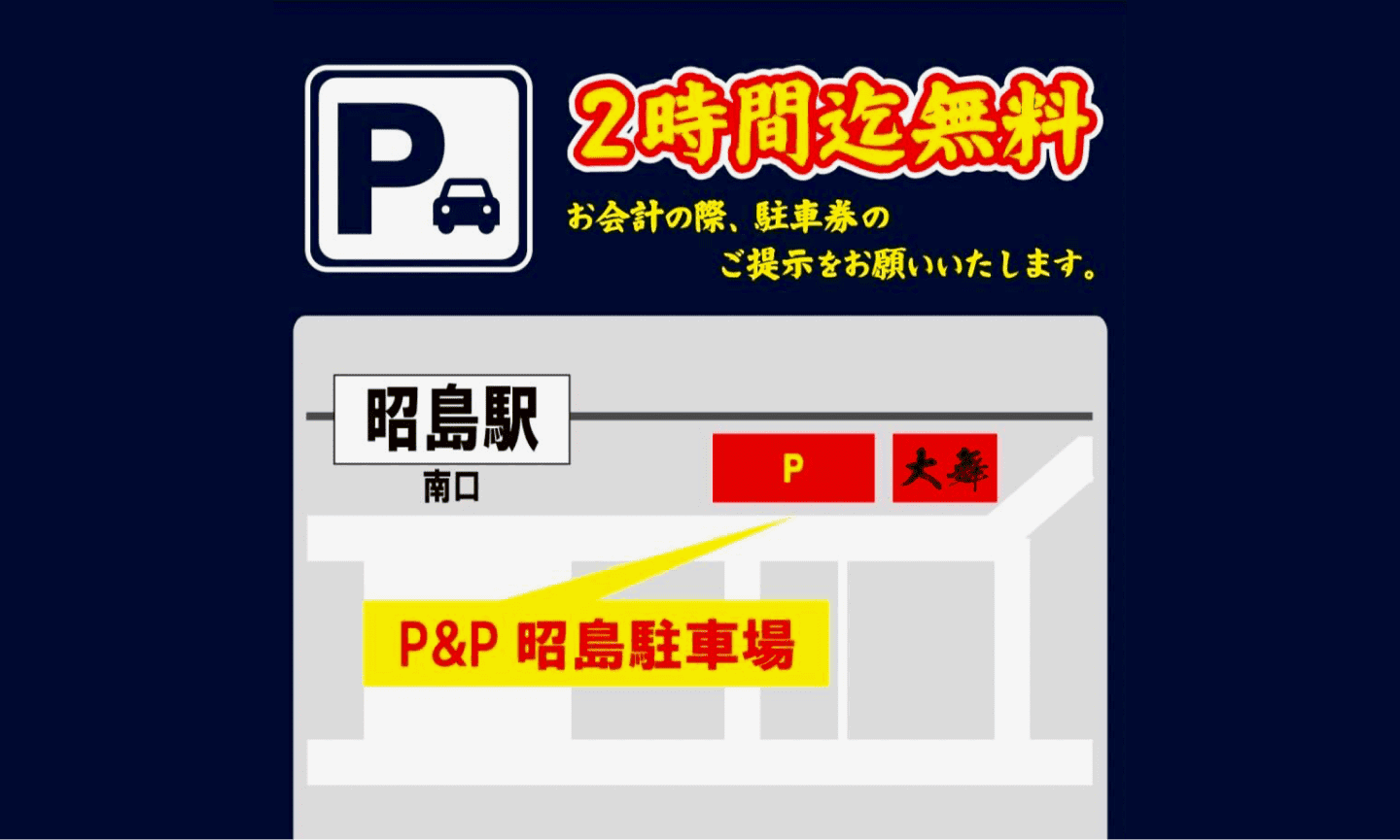 店舗近隣に提携コインパーキングもあり、2時間まで無料(駐車券もしくは駐車証明書にてご確認)となります、お気軽に車でお越し下さい!